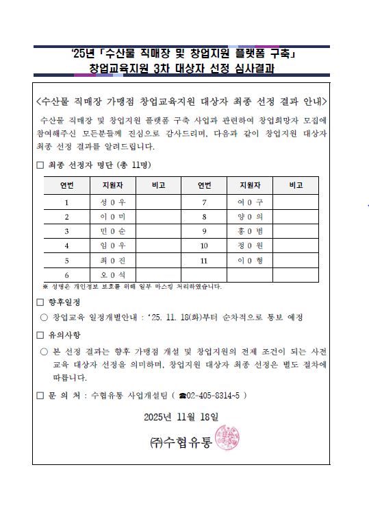 '25년 「수산물 직매장 및 창업지원 플랫폼 구축사업」창업희망자 모집(3차)에 참여해 주셔서 감사드리며,